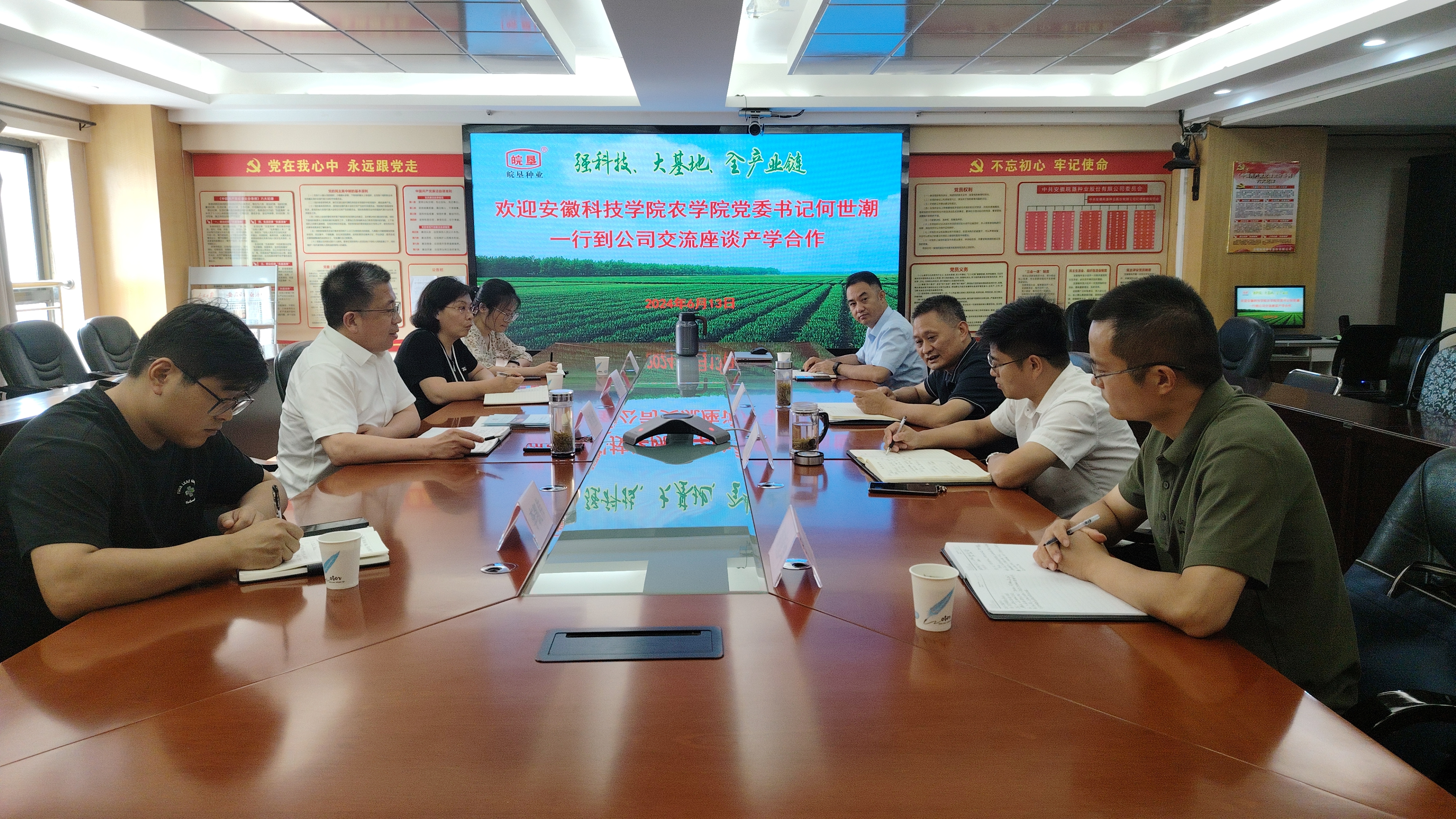 6月13日下午,農(nóng)學(xué)院黨委書記何世潮一行到公司交流座談,公司黨委副書記、總經(jīng)理?xiàng)羁鼘窘陙淼目蒲薪ㄔO(shè)、經(jīng)濟(jì)建設(shè)、人才建設(shè)、上市進(jìn)展及發(fā)展成果進(jìn)行了重點(diǎn)介紹。他指出,近年來在集團(tuán)公司的領(lǐng)導(dǎo)下,皖墾種業(yè)與學(xué)院開展校企合作,并在耕讀文化交流、品種選育、人才培養(yǎng)等領(lǐng)域深入合作,且合作成效明顯。下一步,皖墾種業(yè)將繼續(xù)加大校企合作力度,更好地促進(jìn)產(chǎn)學(xué)融合。何世潮簡要介紹了學(xué)院辦學(xué)歷史、師資力量、學(xué)科建設(shè)及學(xué)術(shù)成果,并肯定了前期校企合作的成效。他表示,皖墾種業(yè)近年來快速發(fā)展,形勢喜人。下一步,學(xué)院將充分利用教育資源,為皖墾提供人力支持,助力皖墾種業(yè)實(shí)現(xiàn)高質(zhì)量發(fā)展。雙方還簽訂了《校企教學(xué)實(shí)踐基地合作協(xié)議》。